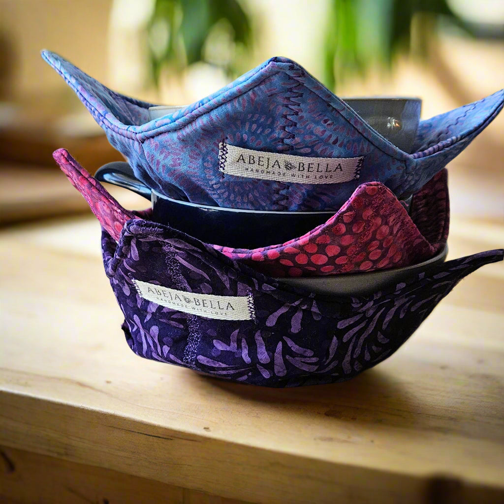 Whether you're indulging in a warm bowl of soup on a winter's day or a cool bowl of ice cream during a binge-watching session, utilize these Bowl Cozies to protect your hands from temperature extremes. Handmade with care, these cozies are both microwaveable (with bowl containing food/liquid) and washable, providing stylish and functional protection.