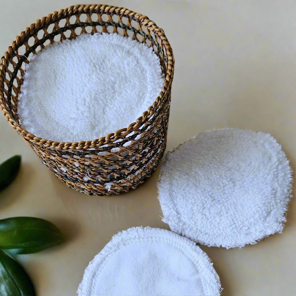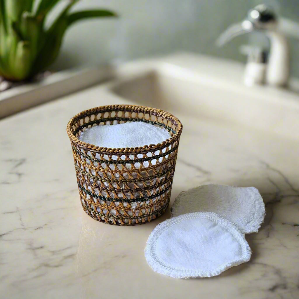 Our Makeup Rounds are compact, reusable, and functional—ideal for your bathroom essentials. All 10 rounds neatly fit into the handwoven mini basket, saving valuable counter space. Each round is hand crafted from soft cotton and absorbent terry cloth to ensure a gentle and effective cleanse.