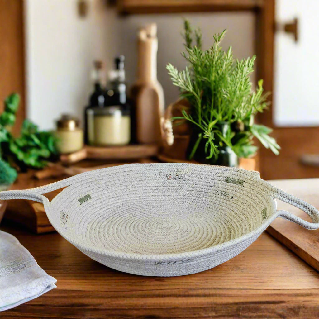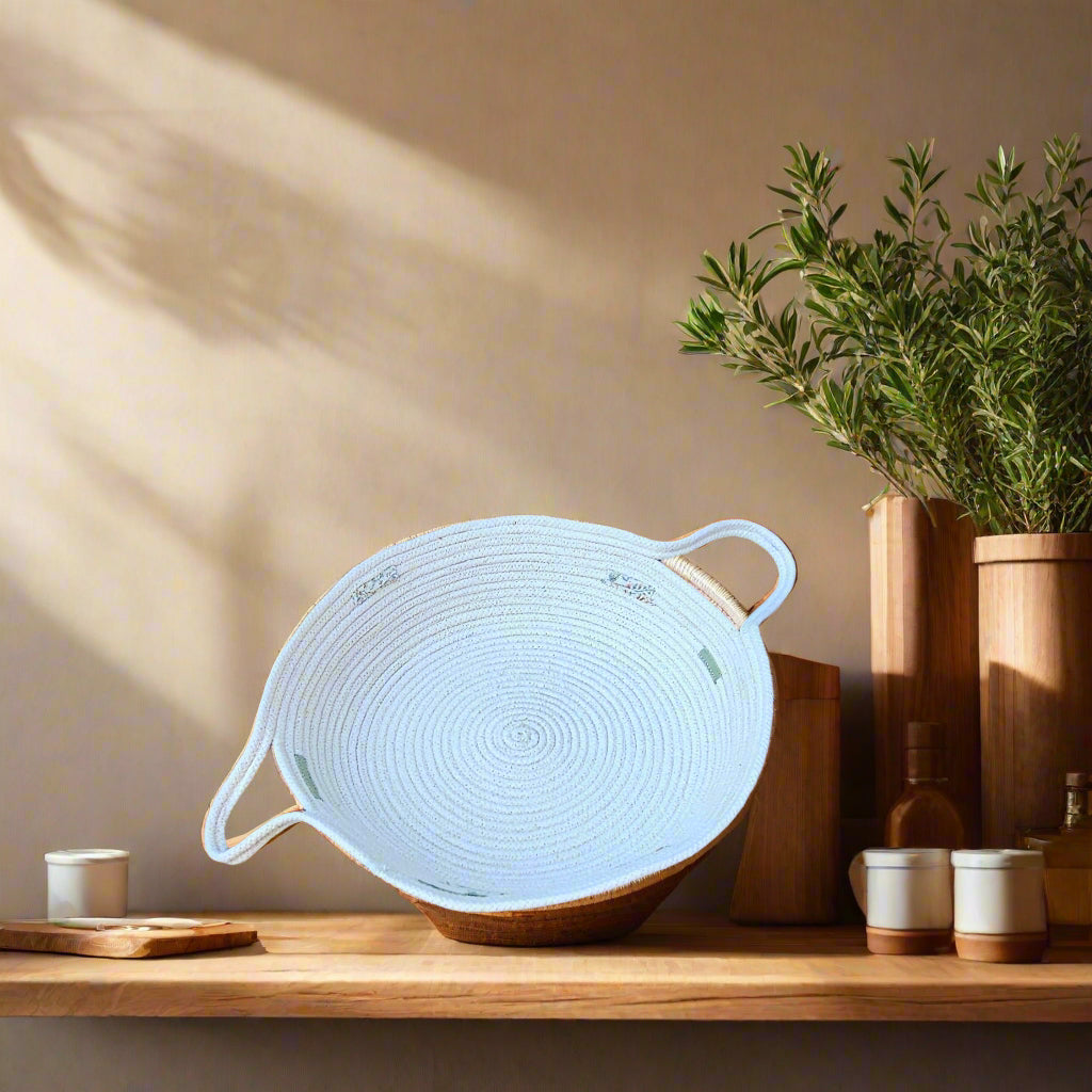 Our thoughtfully handcrafted Rope Baskets, made from cotton rope and accented with coordinating fabrics, offer a reliable solution for keeping your home organized and stylish. Whether you want to showcase seasonal decorations on your coffee table, store bathroom linens and soaps, or keep your bedside area neat, this basket provides practical organization with a charming touch.