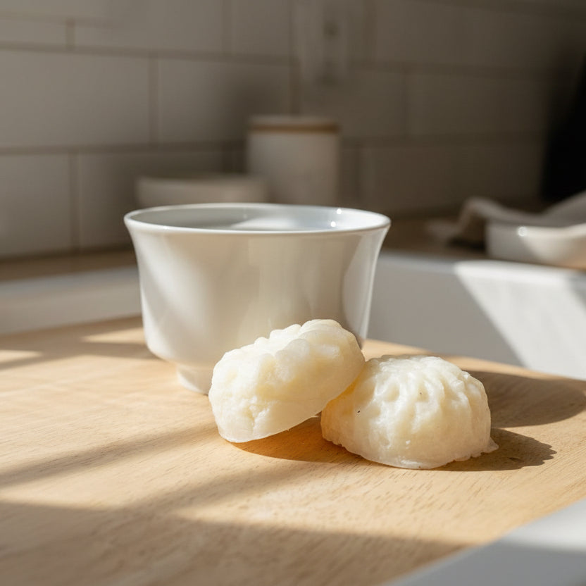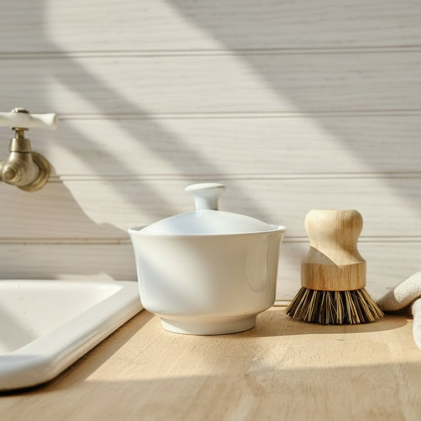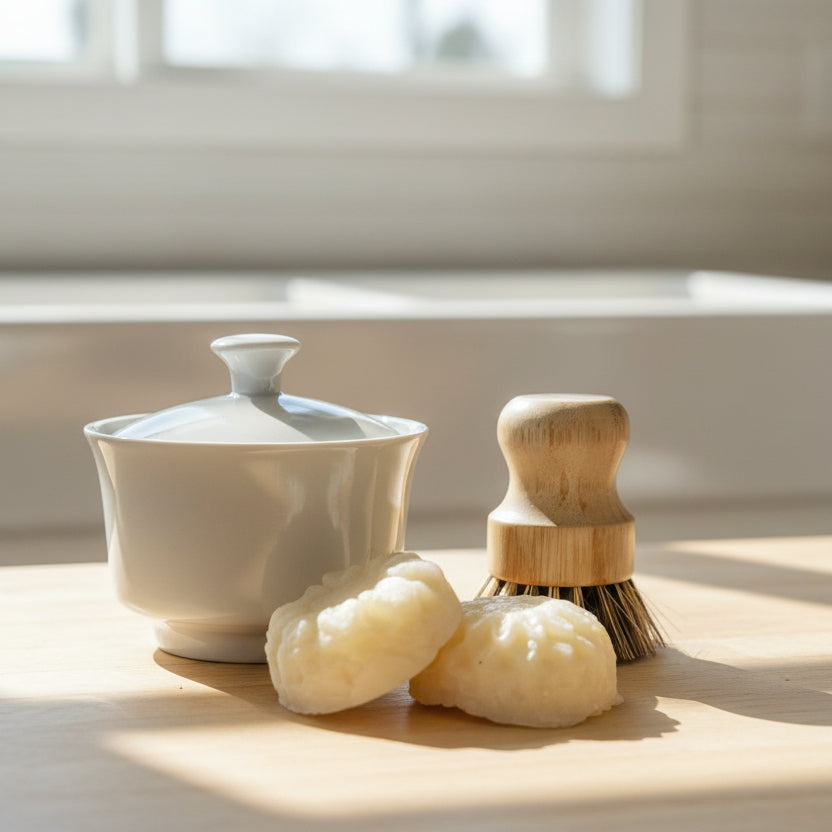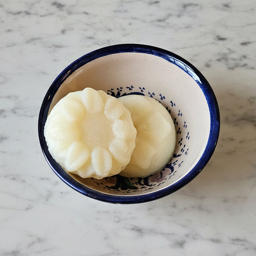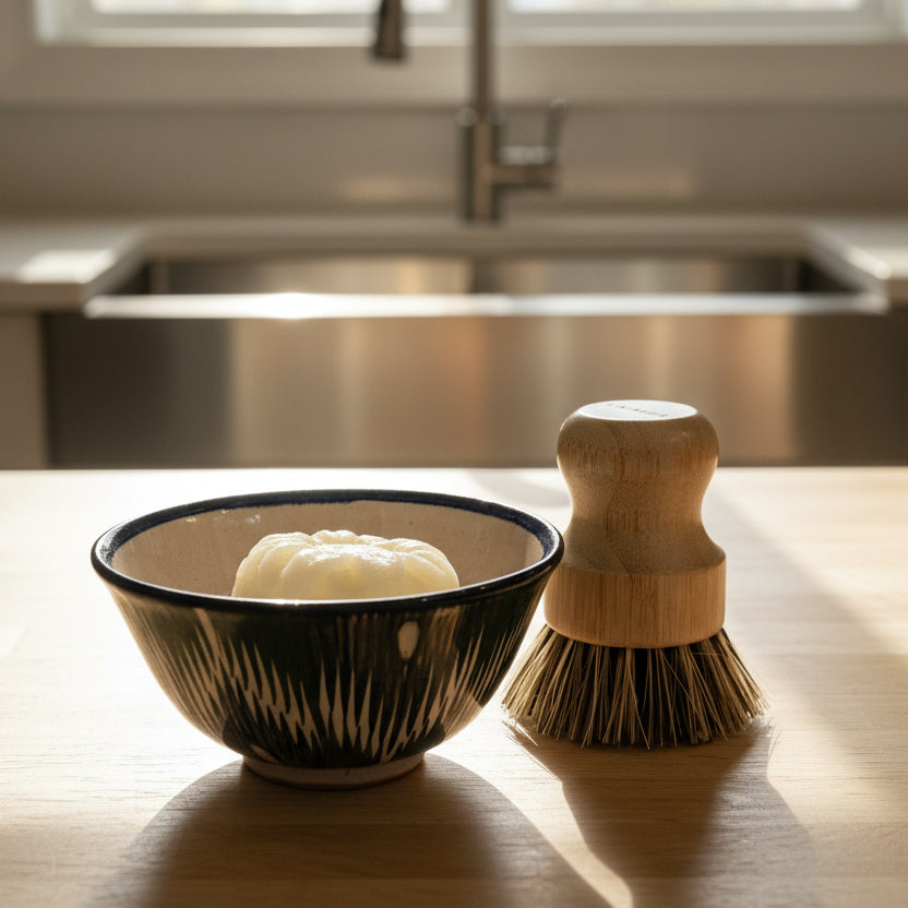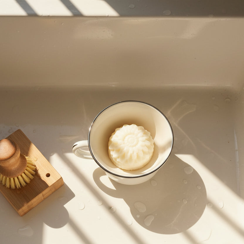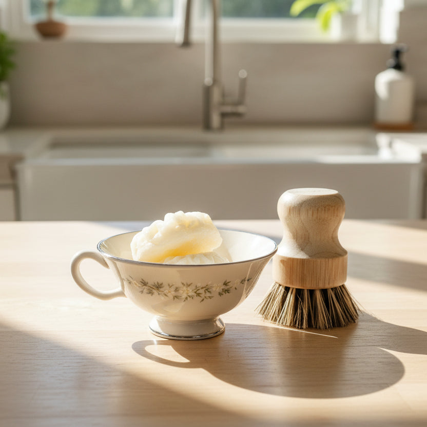 Our Solid Dish Soap is here to support your journey toward a more sustainable home. These beautiful flower bars are crafted from plant-based ingredients that work hard to break down grease and grime while you lather with your sponge or brush. Choose a thrifted container that speaks to you, and you'll have a multi-purpose cleaner that's gentle on the planet and tough on mess. With its uplifting lemon scent and zero plastic packaging, every wash becomes an act of care—for your dishes and for the earth.